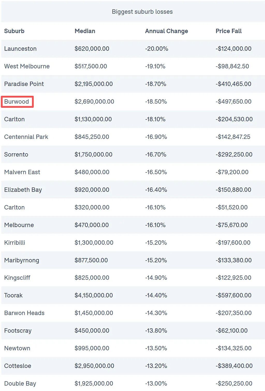 West Melbourne紧随其后,下跌19.1%。黄金海岸Paradise Point则以18.7%的跌幅位列第三。