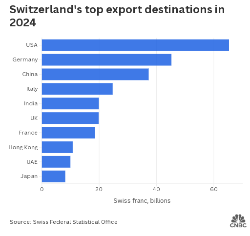 制造业协会 Swissmem 表示,39% 的关税将 “极其沉重地” 打击科技行业、出口,进而影响整个国家,并指出瑞士经济中每两法郎就有一法郎来自对外贸易。