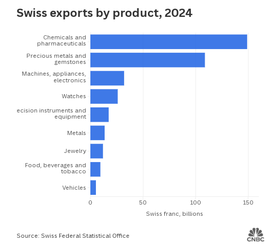 这一影响极为重大,因为美国占瑞士出口总额的约六分之一。今年 4 月,当瑞士避开了最初 31% 的关税计划,与世界大多数国家一样被征收 10% 的临时关税时,企业曾松了一口气。