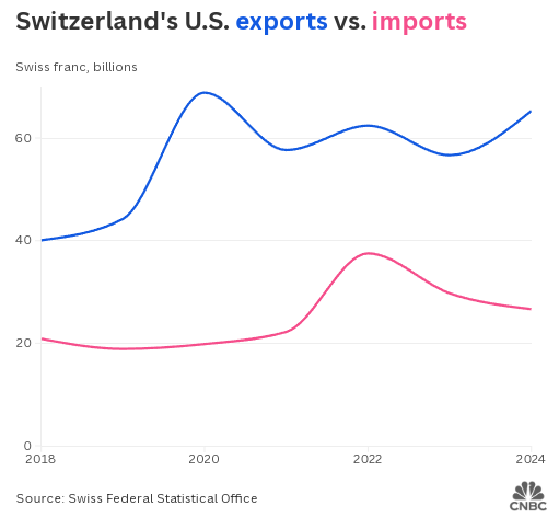 萨加尔接着说,很难说谈判的症结所在,也不清楚 39% 的关税税率是如何计算的。他指出,瑞士与美国在商品和服务贸易整体上是平衡的,但特朗普只关注商品贸易。
